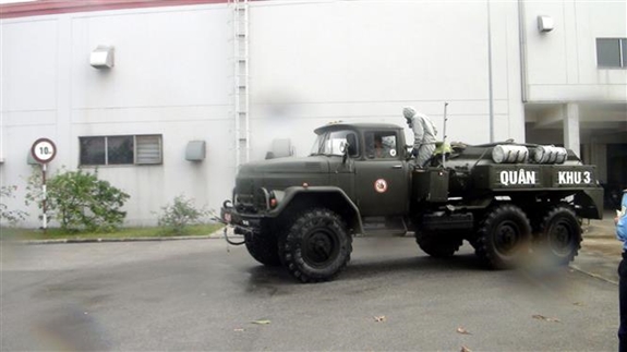 | Xe chuyên dụng của Tiểu đoàn phòng hóa phun khử khuẩn. Ảnh: TTXVN. |