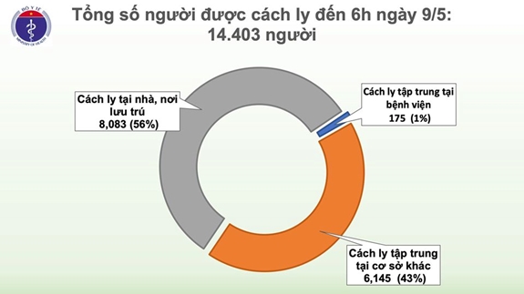 Như vậy tính đến thời điểm hiện tại, Việt Nam ghi nhận tổng cộng 288 người dương tính với virus SARS-CoV-2, trong đó có 148 ca mắc Covid-19 nhập cảnh được cách ly ngay; 241 bệnh nhân được điều trị khỏi, chiếm 84%. Hiện còn 47 bệnh nhân đang điều trị tại 6 cơ sở y tế, trong đó có 4 ca (chiếm 1%) đang điều trị tại các cơ sở y tế đã cho kết quả âm tính lần 1 với virus SARS-CoV-2; 13 ca âm tính lần 2 với virus SARS-CoV-2 (chiếm 5%). Đa số các bệnh nhân đều có sức khỏe ổn định. Tổng số 14.403 người tiếp xúc gần và nhập cảnh từ vùng dịch đang được theo dõi sức khỏe. Trong đó cách ly tập trung tại bệnh viện là 175 người; cách ly tập trung tại cơ sở khác là 6.145 người; cách ly tại nhà, nơi lưu trú là 8.083 người.