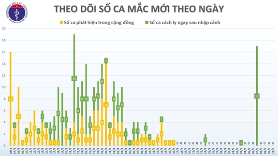 Trong số 288 bệnh nhân mắc Covid-19 đã được ghi nhận tại Việt Nam có 148 ca mắc nhập cảnh được cách ly ngay; 140 ca do lây nhiễm trong cộng đồng; 249 (86%) trường hợp khỏi bệnh. Hiện cả nước còn 39 bệnh nhân mắc Covid-19 đang được điều trị, theo dõi sức khỏe tại 6 cơ sở khám, chữa bệnh. Trong đó, có 8 bệnh nhân có kết quả xét nghiệm âm tính lần 1 với virus SARS-CoV-2 và 11 bệnh nhân có kết quả âm tính hai lần trở lên với virus SARS-CoV-2, chỉ còn lại 20 bệnh nhân có kết quả xét nghiệm dương tính với virus SARS-CoV-2.