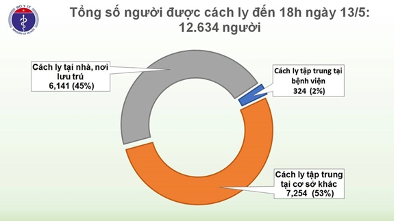 Tính đến chiều 13-5, trong số các bệnh nhân Covid-19 đang điều trị, theo dõi sức khỏe tại 6 cơ sở y tế, hiện đã có 6 bệnh nhân có kết quả xét nghiệm âm tính lần 1 với virus SARS-CoV-2 và 11 bệnh nhân có kết quả âm tính 2 lần trở lên với virus SARS-CoV-2. Hiện chỉ còn lại 19 bệnh nhân Covid-19 có kết quả xét nghiệm dương tính với virus SARS-CoV-2. Tổng số người tiếp xúc gần và nhập cảnh từ vùng dịch đang được theo dõi sức khỏe (cách ly) là 13.719 ngươi. Trong đó, cách ly tập trung tại bệnh viện là 324 người; cách ly tập trung tại cơ sở khác là 7.254 người; cách ly tại nhà, nơi lưu trú là 6.141 người.
