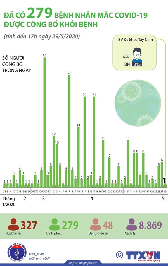 Đó là bệnh nhân số 315 là nam, 39 tuổi, quốc tịch Việt Nam điều trị tại Bệnh viện đa khoa Tây Ninh. Bệnh nhân từ Campuchia trở về Việt Nam vào ngày 2-5, ngày 3-5 bệnh nhân được đưa đi cách tại khu cách ly tập trung của tỉnh Tây Ninh. Ngày 5-5, bệnh nhân được lấy mẫu xét nghiệm và có kết quả âm tính với virus SARS-CoV-2, nhưng đến ngày 15-5, kết quả xét nghiệm lại dương tính với virus SARS-CoV-2. Bệnh nhân được nhập viện vào ngày 16-5. Trong quá trình điều trị, bệnh nhân được xét nghiệm và có kết quả xét nghiệm âm tính với virus SARS-CoV-2 lần 1 vào ngày 27-5 và lần 2 vào ngày 28-5. Hiện tại sức khỏe bệnh nhân ổn định, không sốt, không ho, không khó thở, đủ điều kiện công bố khỏi bệnh. Bệnh nhân sẽ tiếp tục được cách ly và theo dõi sức khỏe trong 14 ngày tiếp theo.
