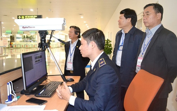 Giám đốc Sở Y tế Hà Nội Nguyễn Khắc Hiền (đứng ngoài cùng bên phải) kiểm tra công tác giám sát dịch Covid-19 tại sân bay Nội Bài. |