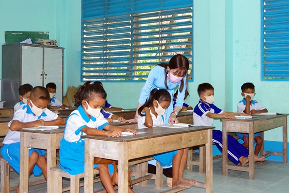 Giáo viên và học sinh đều thực hiện nghiêm việc đeo khẩu trang trong lớp. |