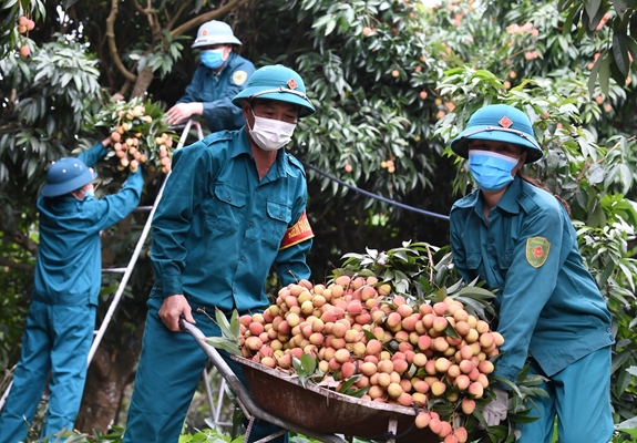 | Dân quân xã Phúc Hòa (Tân Yên, Bắc Giang) vừa tham gia phòng, chống dịch, vừa giúp người dân thu hoạch vải sớm. |