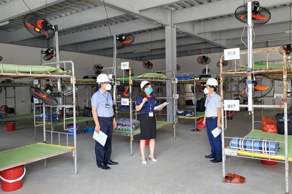 | Xưởng sản xuất của các nhà máy, KCX được bố trí là chỗ ở cho công nhân. Ảnh: BCĐ Covid Bắc Ninh với công nhân. |