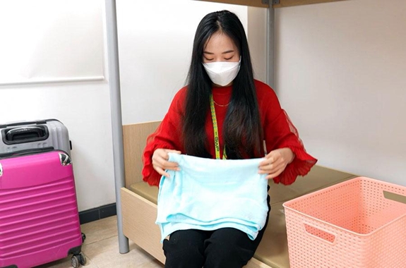 | Một nhân viên trong khu lưu trú tại nhà máy. Ảnh: BCĐ Covid Bắc Ninh với công nhân |
