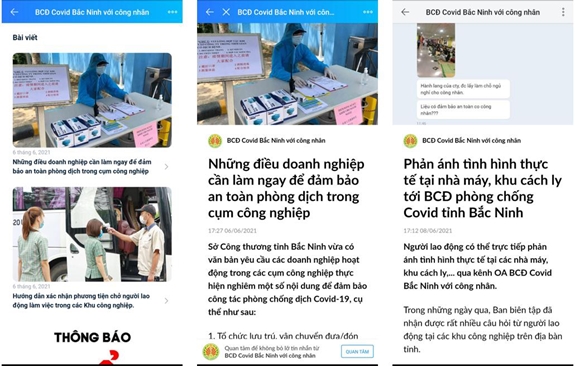 Để giúp công nhân, người lao động nắm bắt kịp thời, chính xác thông tin yên tâm làm việc và chống dịch hiệu quả, từ đầu tháng 6, trang Zalo “BCĐ Covid Bắc Ninh với công nhân” đã được thành lập và nhanh chóng thu hút gần 13.000 lượt “Quan tâm” chỉ sau 4 ngày. Đây là kênh thông báo khẩn đến công nhân, người lao động về tình hình dịch bệnh Covid-19 trên địa bàn tỉnh cũng như tại các doanh nghiệp, nhà máy, nơi lưu trú…