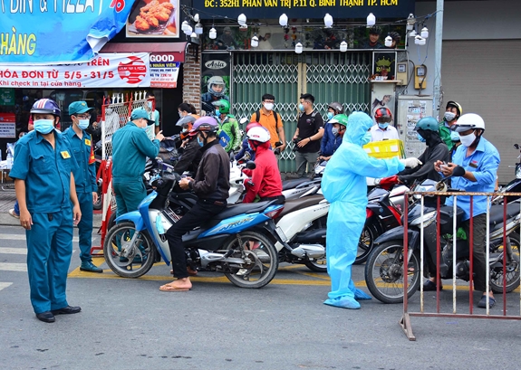 | Lực lượng vũ trang quận Gò Vấp tham gia chốt kiểm dịch giáp ranh với quận Bình Thạnh. Ảnh: HÙNG KHOA |