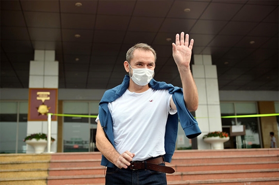 Niềm vui của ông Jean Noel Poirie, cựu Đại sứ Pháp tại Việt Nam được các y sĩ, bác sĩ Bệnh viện Bệnh Nhiệt đới Trung ương cơ sở 2 chữa khỏi bệnh. Ảnh: HOÀNG ANH. |
