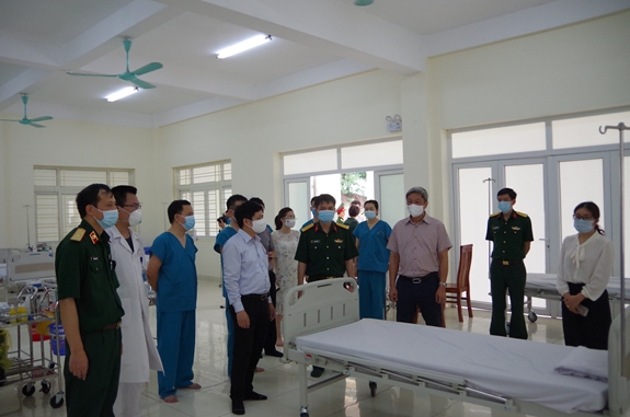 Lãnh đạo Bộ Y tế và Học viện Quân y kiểm tra Bệnh viện dã chiến truyền nhiễm số 2 tại tỉnh Bắc Giang, sáng 21-5.Ảnh: ĐỨC TRỌNG