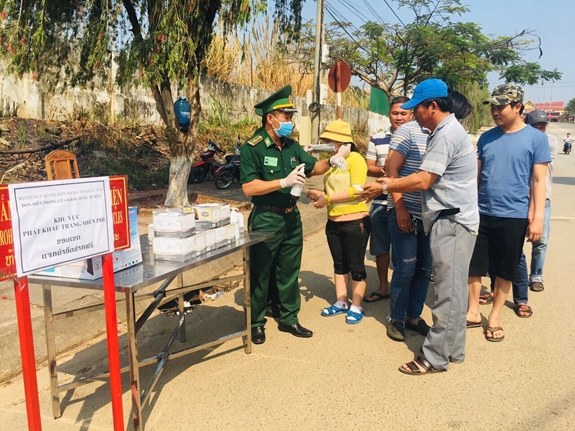 Bộ đội Biên phòng Kon Tum hướng dẫn bà con lau tay bằng cồn và đo thân nhiệt kiểm tra người dân qua lại biên giới. |