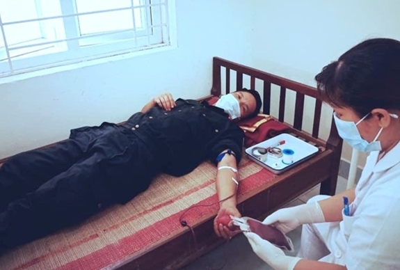 | Thượng úy Đỗ Nam Duy, Thượng úy Lê Bá Tứ và gia đình các cháu được truyền máu. |