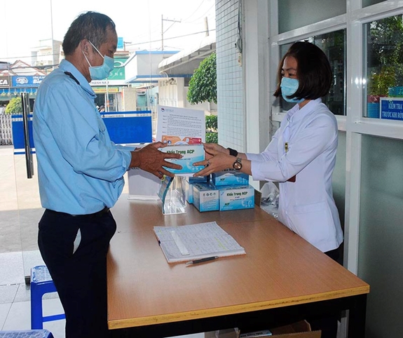 Cán bộ, nhân viên y tế Tổng công ty Tân cảng Sài Gòn phát khẩu trang miễn phí cho người lao động và khách hàng.