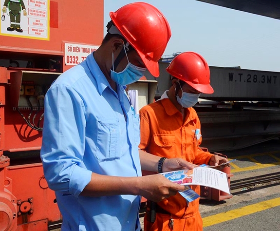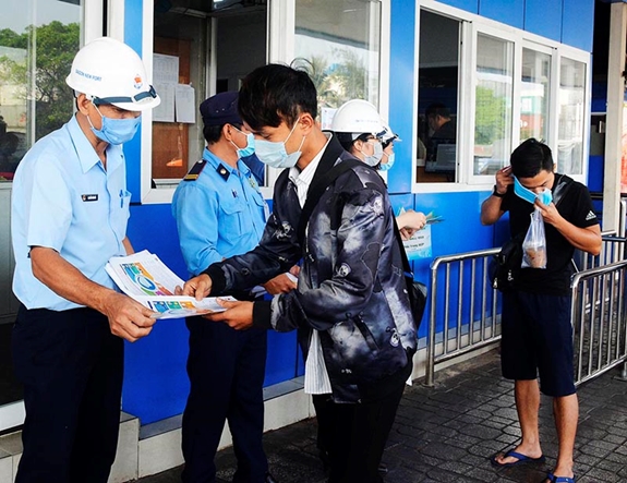 Phát tờ rơi tuyên truyền dịch bệnh cho khách hàng đến với Tân cảng Sài Gòn. |