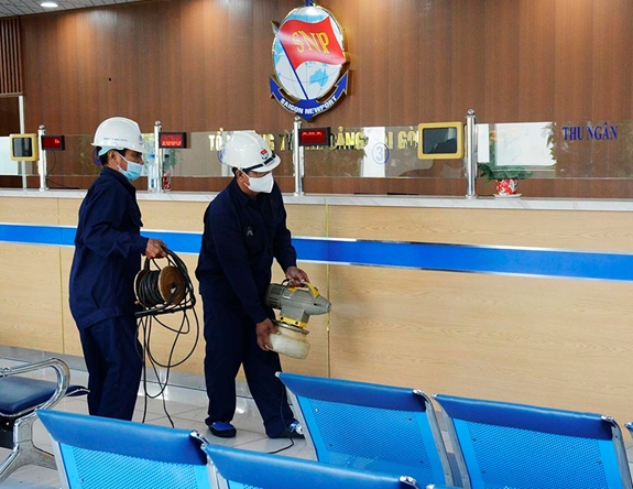 Phun thuốc khử trùng tại nơi làm việc đông người. |