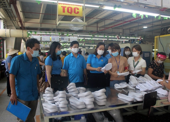 | Lãnh đạo Liên đoàn Lao động tỉnh Thanh Hóa kiểm tra công tác phòng, chống dịch Covid-19 tại Công ty TNHH Giày Adiana Việt Nam. |