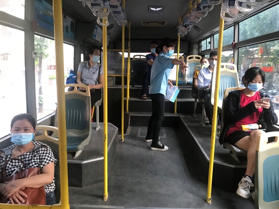 Cứ 5 giờ sáng hằng ngày, những chuyến xe buýt của Trung tâm Tân Đạt-Transerco (Tổng công ty Vận tải Hà Nội) lại từ điểm tập kết ra các tuyến để phục vụ nhân dân. Những ngày gần đây, lượng khách trên xe khá vắng do thành phố đang áp dụng biện pháp giãn cách trên các phương tiện vận tải công cộng. Lái xe, nhân viên bán vé cũng như hành khách đều tuân thủ nghiêm quy định đeo khẩu trang. Trên các xe buýt đều bố trí đầy đủ nước sát khuẩn tay để phục vụ hành khách.