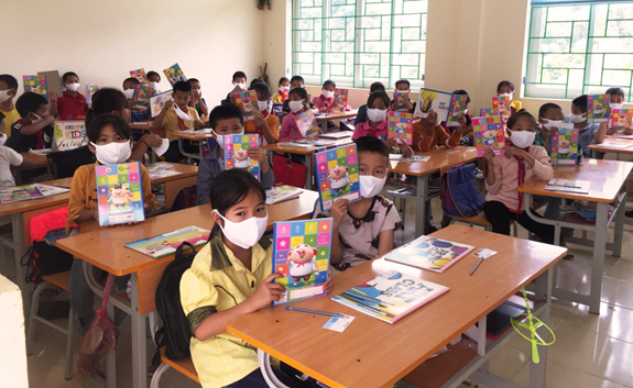 Các em học sinh háo hức với món quà mới. |