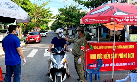 Kiểm tra thân nhiệt người ra vào tại các chốt phòng, chốngdịch Covid-19 trên địa bàn phường Nại Hiên Đông (quận Sơn Trà, TP Đà Nẵng).