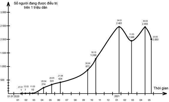 Ngày 27-1-2020, bình quân trên thế giới chỉ có 1 người nhiễm Covid-19 đang được điều trị/1 triệu dân. Ngày 11-3-2020, khi Tổ chức Y tế thế giới WHO công bố: Lây nhiễm Covid-19 đã trở thành dịch toàn cầu, thì bình quân có 10 người nhiễm Covid-19 đang được điều trị/1 triệu dân. Từ đó đến nay số người đang điều trị/1 triệu dân không ngừng tăng lên, phản ánh dịch Covid-19 đang lan rộng, bùng phát toàn thế giới. Ngày 24-1-2021, làn sóng lây nhiễm toàn cầu đạt đỉnh (Hình 1), khi đó số người đang điều trị/1 triệu dân là 2.461, sau đó giảm nhẹ rồi lại tăng đạt đỉnh vào ngày 30-4-2021, sau đó tiếp tục giảm, song còn ở mức cao 2.003 người đang được điều trị/1 triệu dân vào ngày 23-5-2021.