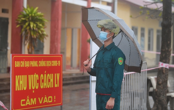 | Chiến sĩ dân quân trực trong khu cách ly tại huyện Tứ Kỳ. |