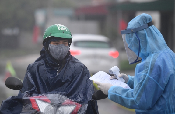 | Nhân viên y tế "đội mưa" kiểm tra thân nhiệt của những người đi qua khu vực kiểm soát dịch bệnh. |