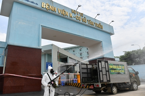 | Phun khử khuẩn tại Bệnh viện K - cơ sở Tân Triều. Ảnh: Viết Chung. |