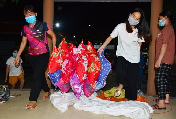 | Các cô giáo, sinh viên nhà trường vận chuyển chăn gối vào phục vụ công dân cách ly. |