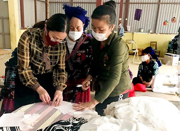 May khẩu trang tặng người nghèo tại Tổ hợp tác thêu truyền thống phụ nữ Mông. |