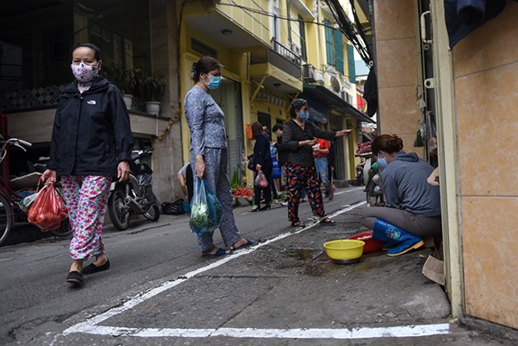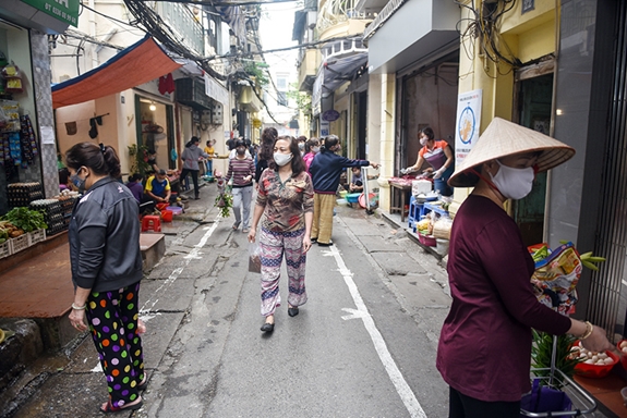Trong đó mô hình kẻ vạch, chia ô tại chợ tạm phố Yên Thái, quận Hoàn Kiếm được UBND phường Hàng Gai thực hiện hiệu quả. Khu vực chợ Yên Thái được thiết lập 3 chốt ở 3 đầu đường vào phố, thường xuyên có lực lượng công an, dân phòng, nhân viên y tế với máy đo thân nhiệt, nước khử khuẩn túc trực để kiểm soát người ra vào, đồng thời không để người dân đưa các phương tiện vào gây cản trở giao thông. Tại chợ, người bán và người mua không ai được bước qua vạch sơn vào sạp bán hàng, mọi người luôn đứng cách xa 2 mét, những trường hợp đứng quá gần, chủ hàng sẽ dừng bán mà nhắc nhở khách. Với việc làm trên sẽ góp phần giúp người dân nâng cao ý thức trong công tác phòng, chống dịch Covid-19 và đảm bảo thuận lợi cho sinh hoạt thường nhật trong thời gian thành phố tiếp tục thực hiện giãn cách xã hội.