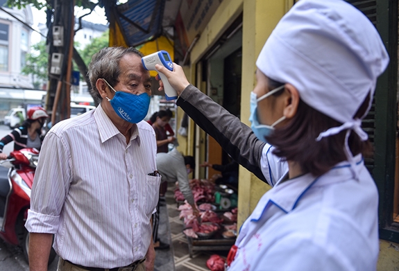 Lực lượng y tế luôn túc trực để đo thân nhiệt và nhắc nhở người dân về các biện pháp phòng, chống dịch bệnh Covid-19. |
