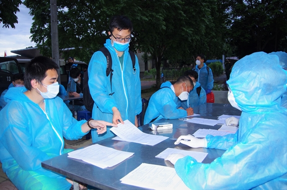 | Công dân khai báo y tế trước khi vào khu cách ly tại Trung đoàn 59. Ảnh: XUÂN TÙNG. |