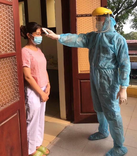 | Nhân viên Trung tâm Đào tạo nghề Thành An (Binh đoàn 11) kiểm tra thân nhiệt cho người cách ly. |