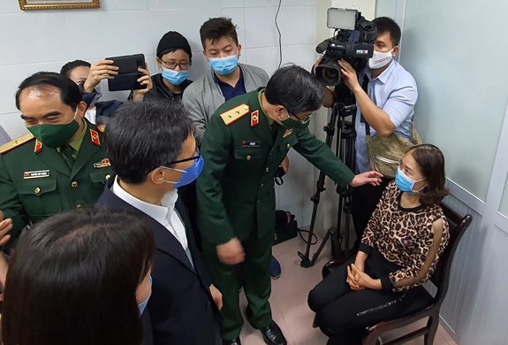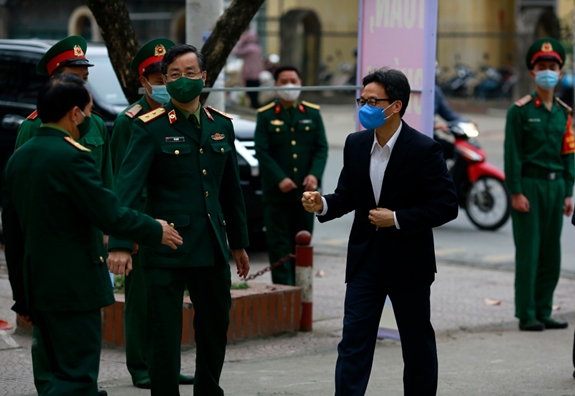 | Phó thủ tướng Vũ Đức Đam và lãnh đạo Học viện Quân y kiểm tra công tác chuẩn bị tiêm thử nghiệm. |
