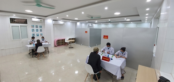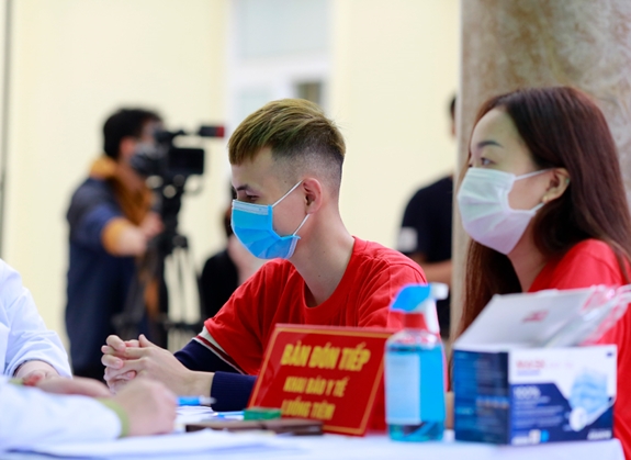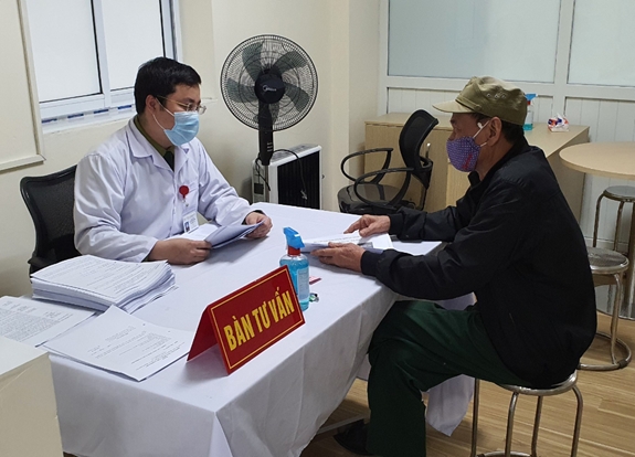 | Tình nguyện viên được tư vấn và khám sức khỏe đảm bảo giãn cách. |