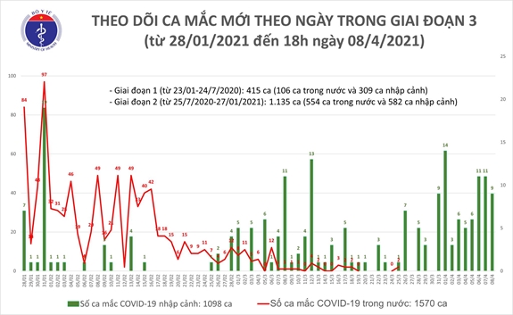 Như vậy tính đến chiều 8-4, Việt Nam có tổng cộng 1.603 ca mắc Covid-19 do lây nhiễm trong nước, trong đó số lượng ca mắc mới tính từ ngày 27-1 đến nay là 910 ca. Tổng số người tiếp xúc gần và nhập cảnh từ vùng dịch đang được theo dõi sức khỏe (cách ly) là 36.971 người. Trong đó, cách ly tập trung tại bệnh viện là 516 người; cách ly tập trung tại cơ sở khác là 20.830 người; cách ly tại nhà, nơi lưu trú là 15.625 người.