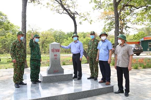 | Đoàn công tác nắm tình hình biên giới tại cột mốc số 46. |