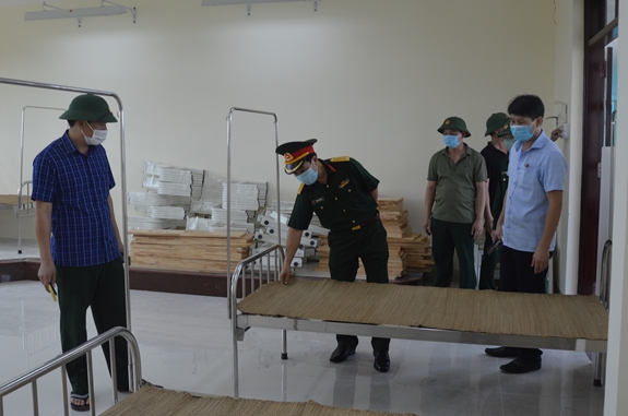 | Lãnh đạo Bộ CHQS tỉnh Bắc Ninh kiểm tra khu vực chuẩn bị tổ chức điểm cách ly tập trung. Ảnh: NGUYỄN HÙNG |