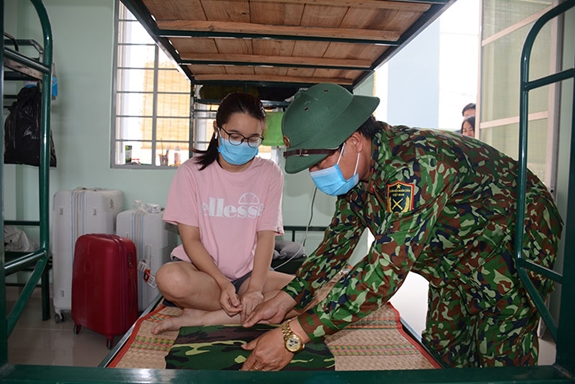 Cán bộ Ban CHQS TP Nha Trang hướng dẫn công dân duy trì nội vụ, vệ sinh tại khu cách ly.
