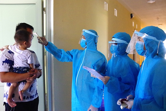 Các nhân viên y tế tại khu cách ly Cổng B, Cửa khẩu Quốc tế Cầu Treo, huyện Hương Sơn thường xuyên kiểm tra thân nhiệt công dân cách ly tại đây. |