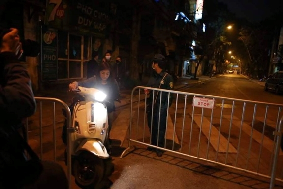 Lực lượng chức năng kiểm soát ra vào trên phố Trúc Bạch. Ảnh: dantri.com.vn |
