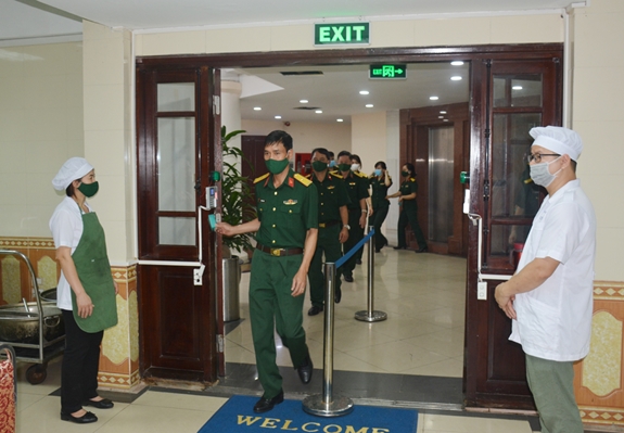 Qua trò chuyện, tôi được biết, từ khi dịch bệnh diễn biến phức tạp, công tác vệ sinh, bảo đảm an toàn nhà ăn, nhà bếp luôn được các anh đặt lên hàng đầu. Hằng ngày, các dụng cụ chia, bát đũa đều được nhúng nước sôi trước giờ ăn; sau khi ăn xong, tất cả các bàn ăn, tấm chắn đều được nhân viên vệ sinh sạch sẽ bằng dung dịch sát khuẩn. Hai ngày một lần, nhân viên quân y của cơ quan sẽ tổ chức phun khử khuẩn toàn bộ hệ thống nhà ăn, nhà bếp và các khu vực xung quanh. Các nhân viên phục vụ đều phải đeo khẩu trang, mặc đồ bảo hộ, đeo găng tay khi chia thức ăn. Cơ quan cũng bố trí đầy đủ các dung dịch sát khuẩn, xà phòng chuyên dụng để cán bộ, nhân viên vệ sinh tay trước và sau khi ăn xong.
