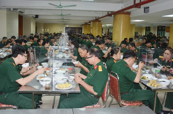 Gần đến giờ ăn trưa nên khi vào nhà ăn, tôi thấy ở một góc, các nhân viên của Đội Cấp dưỡng (Cục Hậu cần) đang tất bật chia các suất ăn. Đứng cạnh đó, Đại tá Lê Ngọc Hồ, Trưởng phòng Quân nhu (Cục Hậu cần) cùng đồng chí nhân viên quân y của cơ quan đang kiểm tra chất lượng bữa ăn và lấy mẫu lưu nghiệm. Chỉ tay vào dãy bàn ăn được xếp ngay ngắn, thẳng hàng, giãn cách hợp lý, Đại tá Lê Ngọc Hồ cho biết: Trước tình hình dịch Covid-19 diễn biến hết sức phức tạp, để đảm bảo phòng, chống dịch, thủ trưởng Tổng cục Hậu cần đã chỉ đạo Cục Hậu cần nghiên cứu, triển khai lắp đặt hệ thống kính chắn trên bàn ăn, tổ chức lại nhà ăn bảo đảm giãn cách khoa học, hợp lý, hạn chế tối đa tình trạng tụ tập đông người, tiếp xúc trực tiếp quá gần trong nhà ăn. Kinh phí lắp đặt hệ thống tấm kính chắn do Cục Hậu cần trích từ nguồn lãi tăng gia sản xuất.