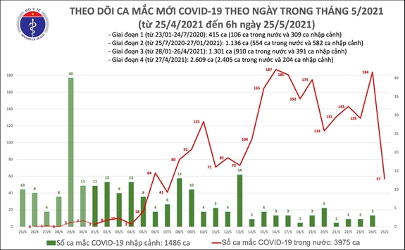 Như vậy tính đến sáng 25-5, Việt Nam có tổng cộng 3.975 ca ghi nhận trong nước và 1.486 ca nhập cảnh. Số lượng ca mắc mới tính từ ngày 27-4 đến nay là 2.405 ca. Có 6 tỉnh: Yên Bái, Quảng Ngãi, Đồng Nai, Nghệ An, Quảng Ninh, Quảng Nam đã qua 14 ngày không ghi nhận trường hợp mắc mới. Số lượng xét nghiệm từ ngày 29-4 đến nay đã thực hiện 890.454 xét nghiệm cho 1.629.867 lượt người. Tổng số người tiếp xúc gần và nhập cảnh từ vùng dịch đang được theo dõi sức khỏe (cách ly) là 165.935 người. Trong đó, cách ly tập trung tại bệnh viện là 5.307 ca; cách ly tập trung tại cơ sở khác là 35.896 ca; cách ly tại nhà, nơi lưu trú là 124.732 ca.