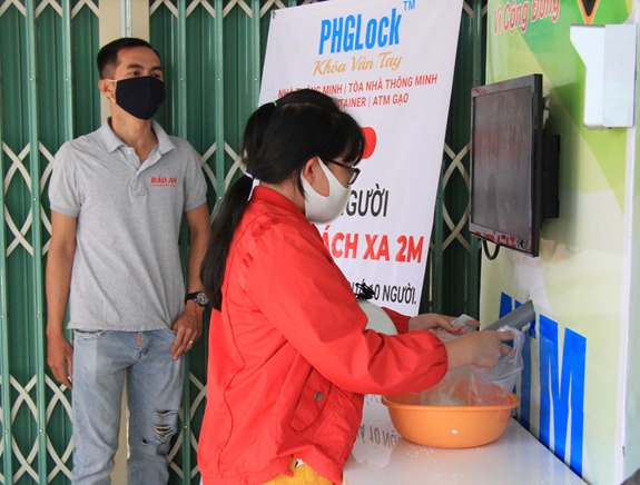 Người dân nhận gạo từ “ATM gạo” tại huyện Đức Trọng, tỉnh Lâm Đồng. |