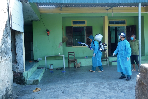 | Lực lượng dân quân khử khuẩn toàn bộ thôn bị phong tỏa Vân Tập, xã Minh Châu, huyện Diễn Châu, tỉnh Nghệ An. |