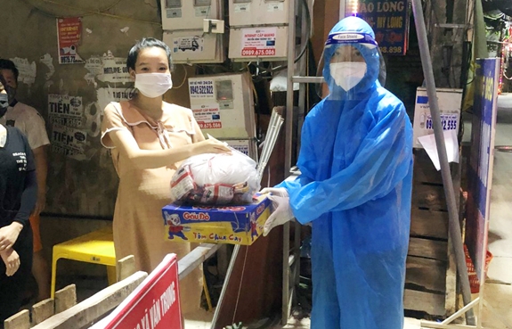 | Giáo viên Phan Thị Hằng mặc áo bảo hộ tặng quà người dân khu trọ Trung Đồng, xã Vân Trung, huyện Việt Yên (Bắc Giang). |