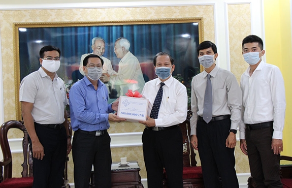Các đơn vị trao ủng hộ cho Ủy ban MTTQ Việt Nam TP Hồ Chí Minh chiều ngày 6-4. |