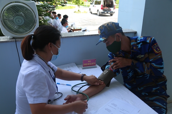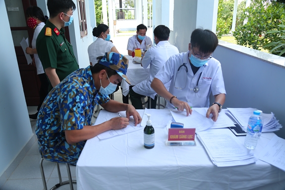 | Cán bộ, chiến sĩ được khám sàng lọc trước khi tiêm phòng. |