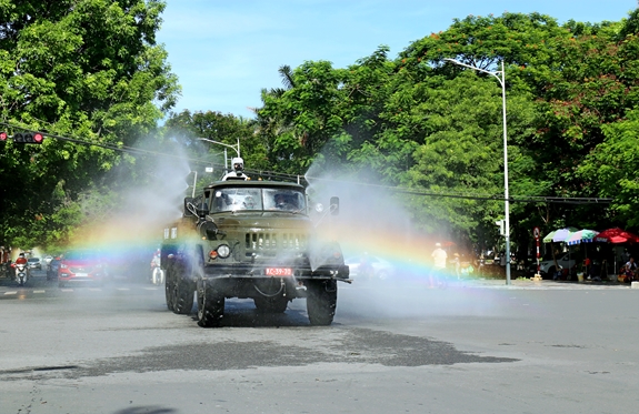 Tiểu đoàn Phòng hóa 38 phun thuốc tiêu tẩy trên các trục đường chính của thành phố Hải Phòng. |